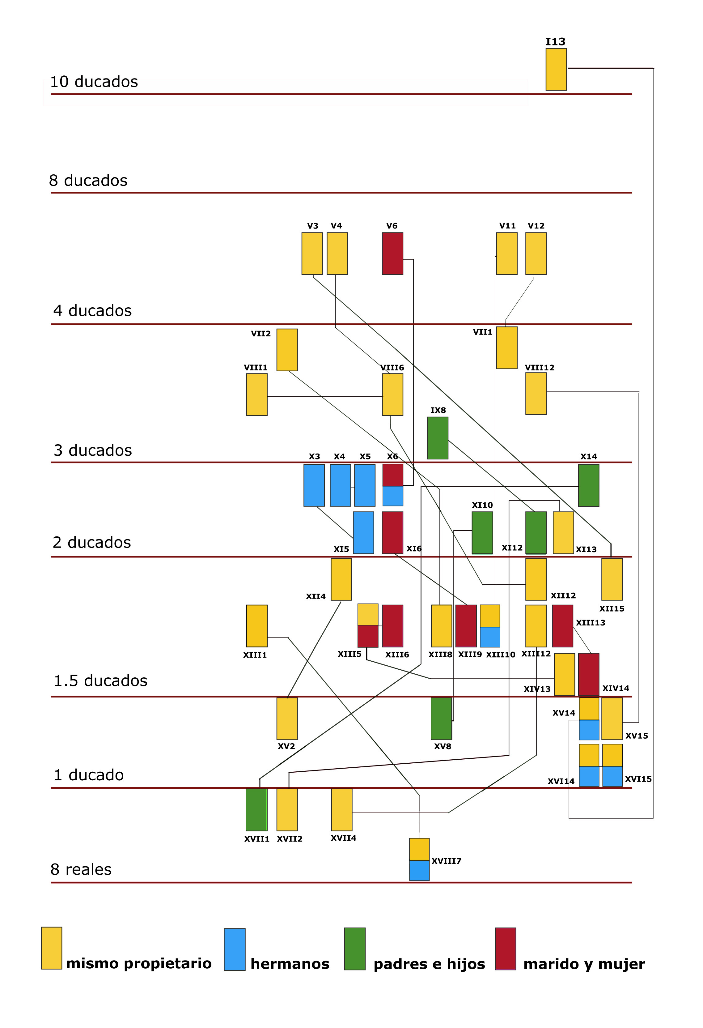 Gráfico realizado a partir del documento estableciendo distintas relaciones: personas que son dueñas de varias tumbas, hermanos que comparten sepulturas, padres e hijos o matrimonios. / ELABORACIÓN PROPIA