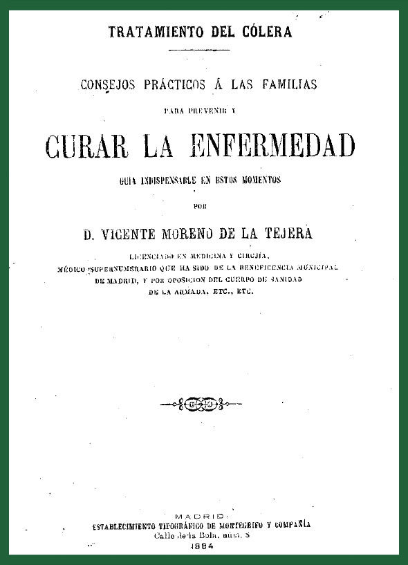 Vacunación contra el cólera en España, según la portada de 1855 de L'Illustration. En el centro, Consejos prácticos a las familias para curar la enfermedad publicado en 1884 por Vicente Moreno de la Tejera. A la derecha, portada de Observaciones sobre El Cólera-Morbo de la Academia de Medicina, Cirugía y Farmacia de Jaén de 1855