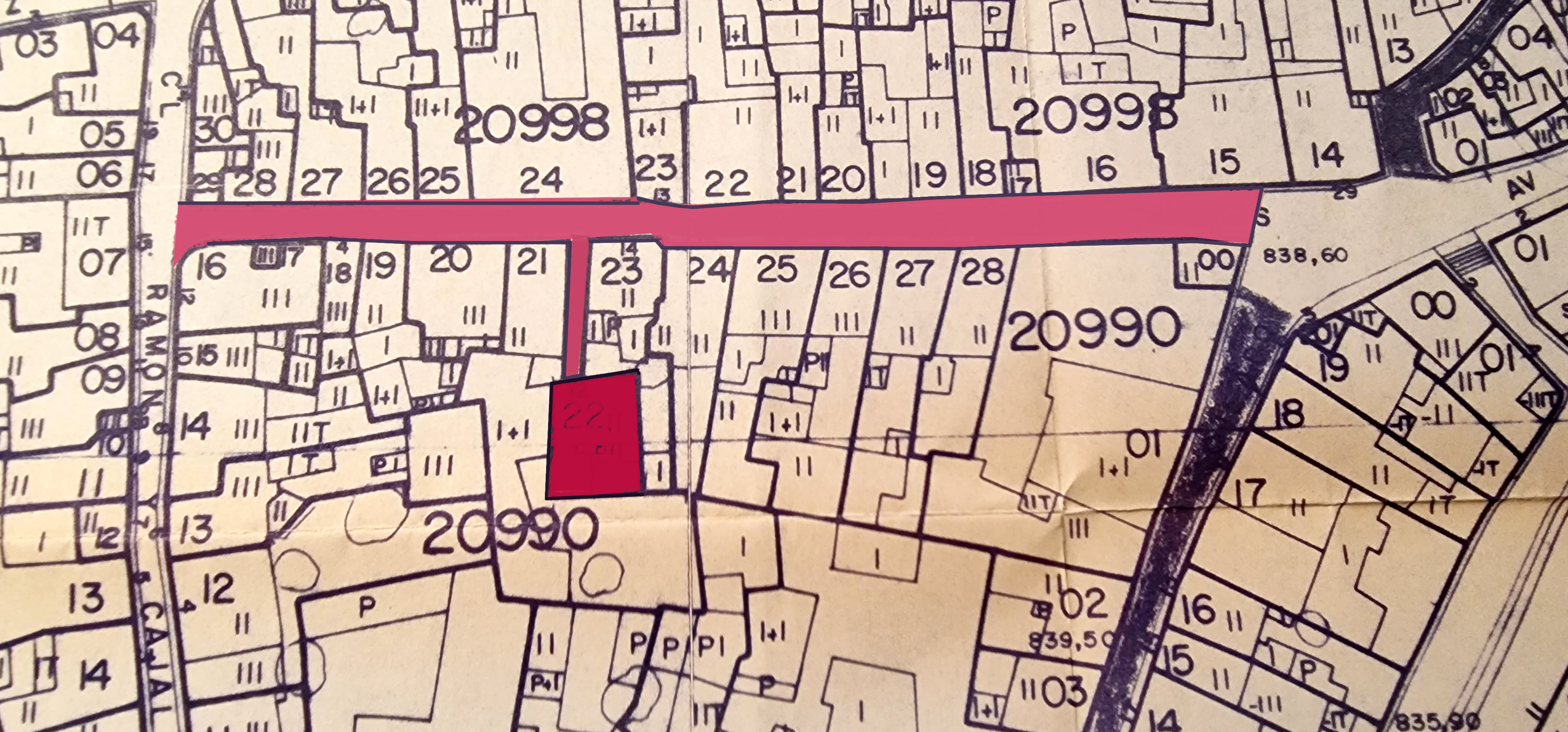 Detalle de un plano de los años 90 de la calle Charcos de Villapalacios. Sombrada en rojo intenso, la casa del número 12 en la que ha aparecido la inscripción de 1788.