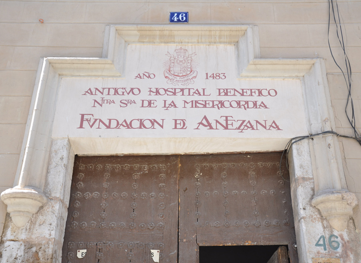 Hospital Antezana de Alcalá de Henares, llamado también Hospital de Nuestra Señora de la Misericordia o el Hospitalillo, considerado el más antiguo de España, pues abrió en 1483. En el centro, postal de Hauser y Menet de c. 1902 de la calle Mayor donde se ve la fachada del hospital. Y abajo, detalle de una de las puertas principales de la fachada, en una foto de la Universidad de Alcalá de Henares.