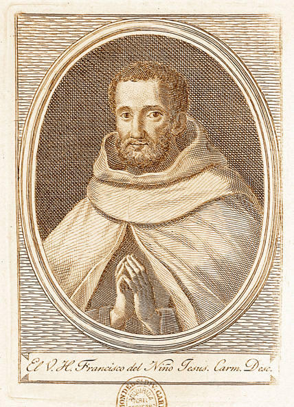 Imagen que ilustra la portada del libro Historia de la vida y virtudes del venerable Hermano Fray Francisco del Niño Jesús, religioso de la Orden de los Descalzos de N. Señora del Carmen, de José de Jesús María, publicado en 1604 en Uclés, poco tiempo después de fallecer el Hermano Francisco.
