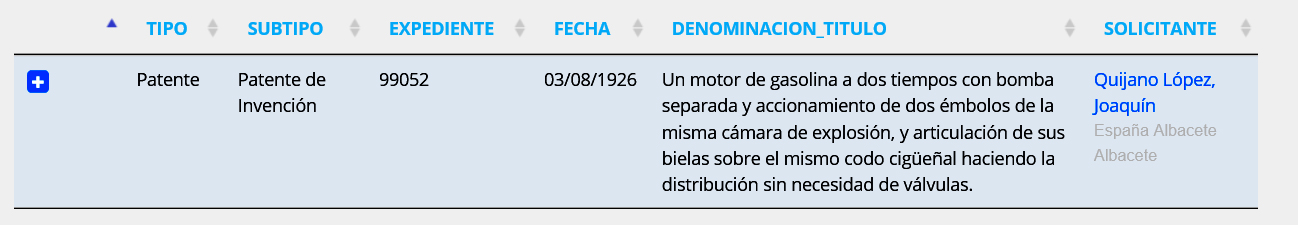 En la base de datos del Archivo Histórico de la Oficina de Patentes y Marcas sigue apareciendo la gesta de Joaquín: la patente de "un motor de gasolina a dos tiempos con bomba separada y accionamiento de dos émbolos de la misma cámara de explosión, y articulación de sus bielas sobre el mismo codo cigüeñal haciendo la distribución sin necesidad de válvulas".