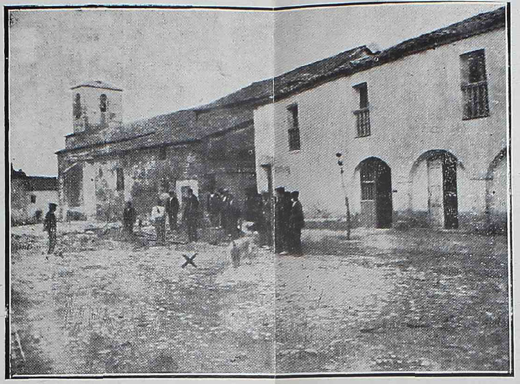 No hay imágenes de este reloj del siglo XIX, pero analizando algunas de las fotografías antiguas podemos intuir dónde estuvo. La primera es la realizada en 1925, durante el viaje que realizó a Villapalacios miembros de la revista Centauro en la primavera de ese año en la que se ve la plaza antes de la construcción del pilón que sabemos se inauguró el 15 de junio de 1925. Al final, en la torre se ve, perfectamente, dos de las aperturas donde estarían las campanas y comprobamos que los vanos son mucho menores que en la actualidad.